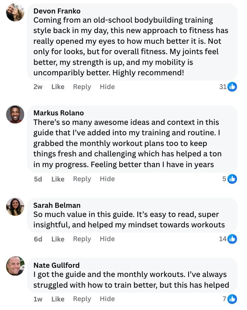 Stephan K.Verified Buyer“Macros without the math headache...”"This guide makes hitting your protein target easy, without tracking every gram yet making sure to get all your macros without the math headache.... It’s full of smart meal ideas that just naturally fit the plan. It’s like healthy eating on autopilot."Functional Bodybuilding: Monthly Workout Plans & Guides Was this helpful? 15 0