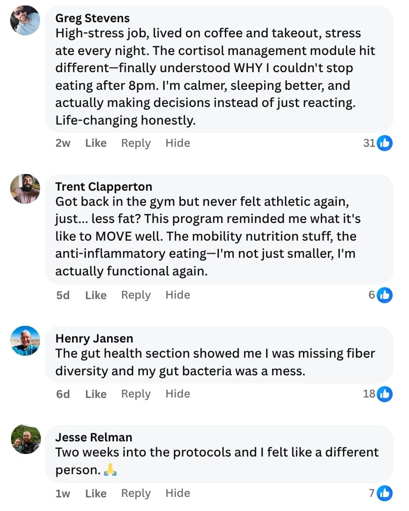 July 11, 2025Nathan L.Verified Buyer"The gut health and inflammation stuff blew my mind...""I ate pretty healthy already but wasn't seeing the results I wanted. Turns out "pretty healthy" and "optimized" are very different. The gut health and inflammation stuff blew my mind. My body comp changed more in 12 weeks than it did in the previous year. There's levels to this."Total-Body Transformation Blueprint: The Done-For-You Meals & Workout Plan Was this helpful? 14 0